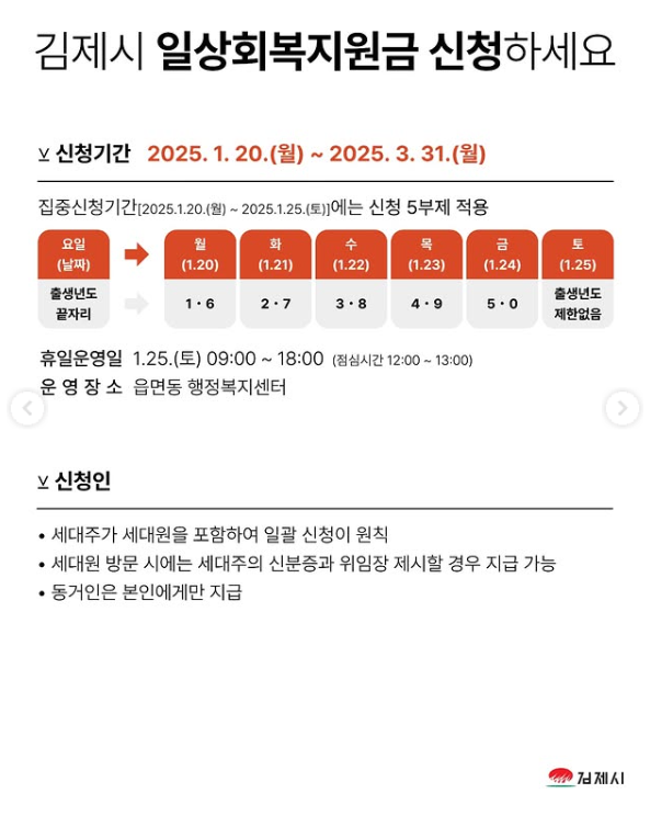 - 2024년 12월 31일 기준으로 김제시에 주민등록을 두고 있으며, 신청일까지 거주 상태가 유지된 시민.