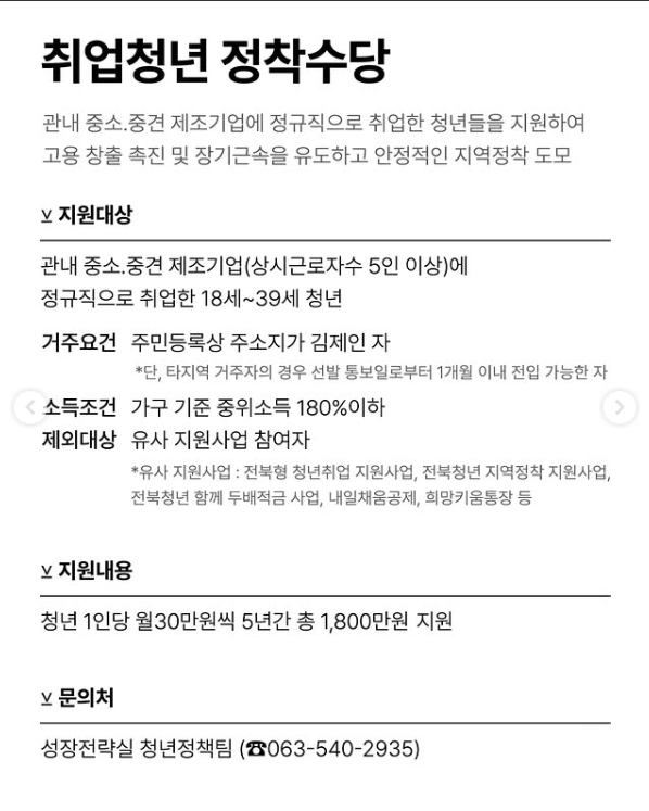 - 대상: 김제 소재 중소·중견 제조기업에 정규직으로 취업한 18세~39세 청년.