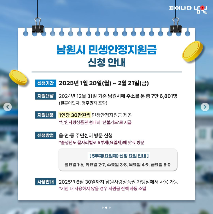 - 지급 형태: 남원사랑상품권 형태의 선불카드.
