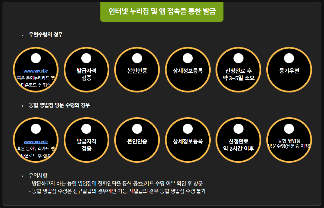 - 모바일 발급: 문화누리카드 앱 설치 후 신청
