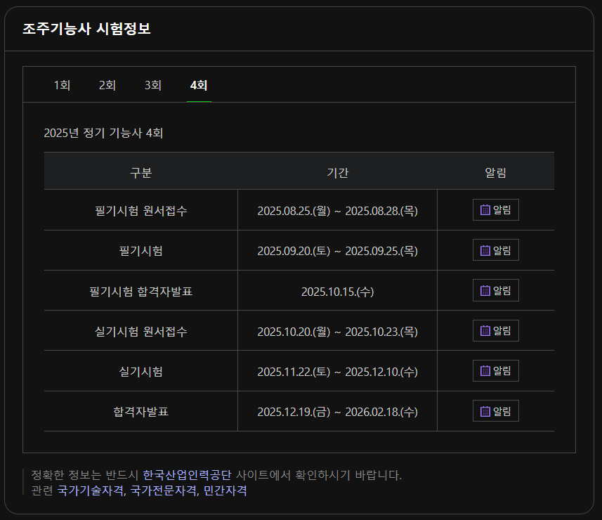 - 4회: 원서 접수 8월 20일 ~ 23일 / 시험 9월 5일 ~ 9일