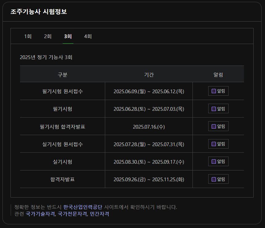 - 3회: 원서 접수 6월 1일 ~ 5일 / 시험 6월 21일 ~ 25일