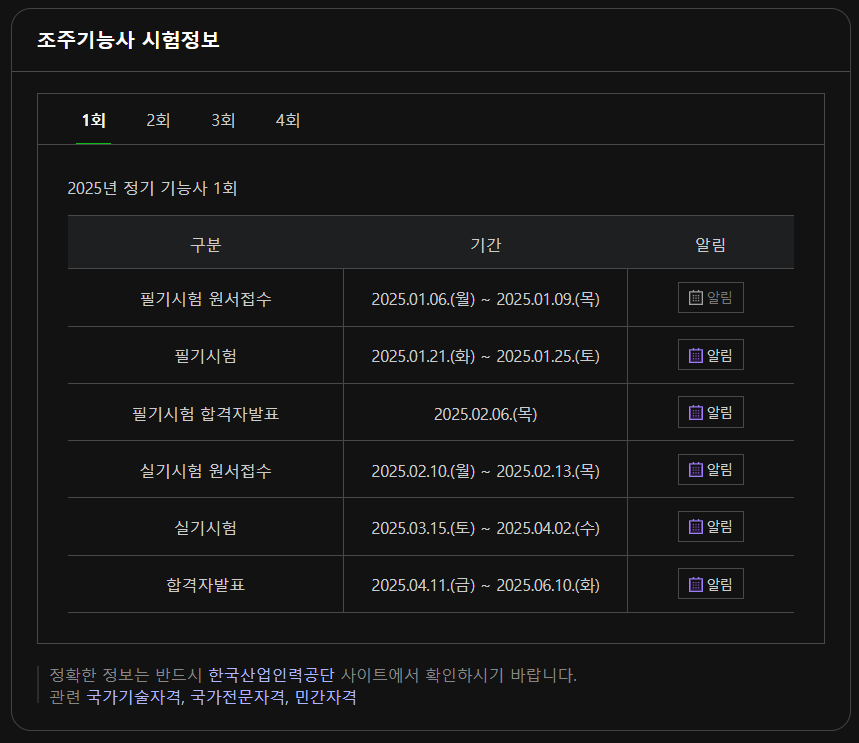 조주기능사 시험은 매년 필기와 실기가 따로 4회씩 시행됩니다. 2025년 시험 일정은 아래와 같습니다: