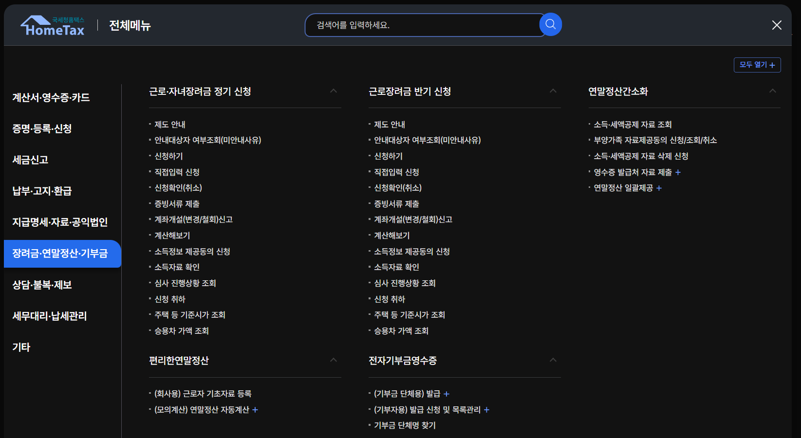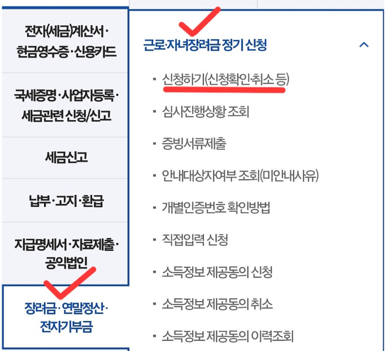 - 절차: 로그인 → 신청/제출 → 근로·자녀장려금 신청