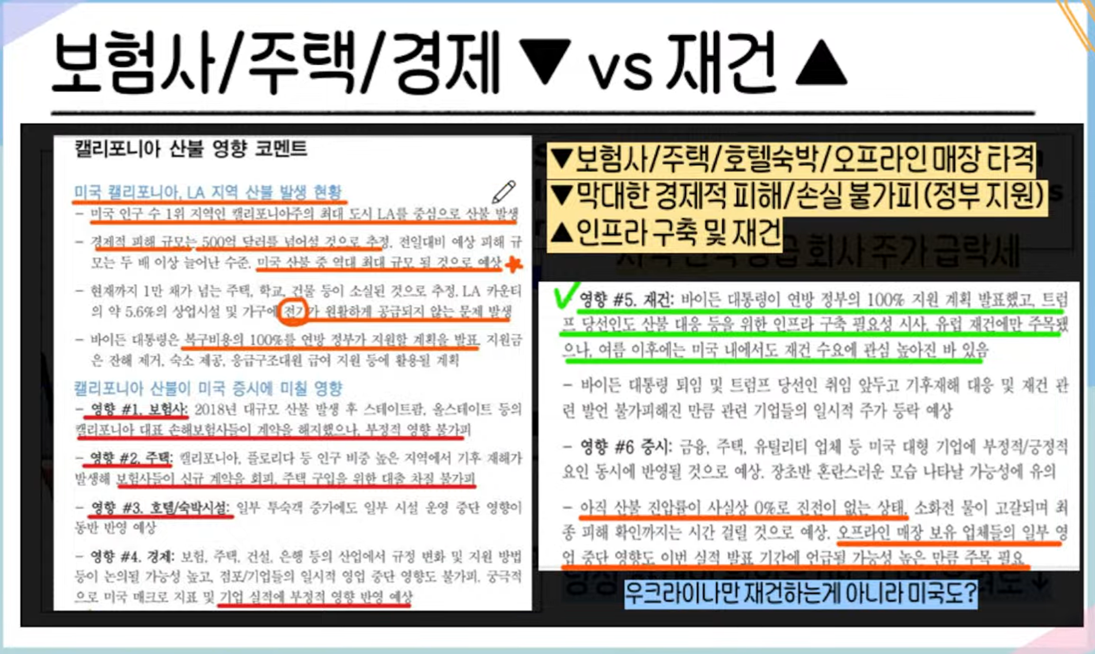 - 인프라 복구: 전력망 재설치, 주택 재건축 등 대규모 재건 작업이 필요할 전망.