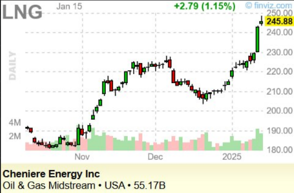 - 셰니어 에너지는 미국 최대 LNG 수출업체로, 최근 주가가 $245.88을 기록하며 52주 최고치를 경신했습니다.