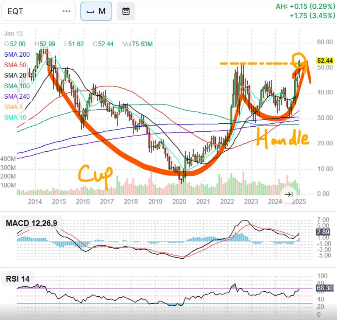 EQT는 최근 기술적 분석에서 컵앤핸들 패턴을 완성 중인 것으로 나타났습니다.
